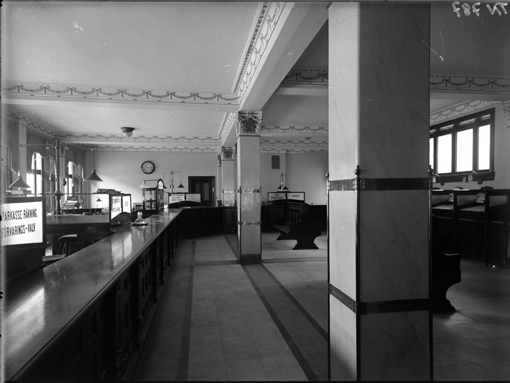 Enligt tidigare noteringar: "Interiör från banklokal, Göteborgs Bank, Uddevalla."