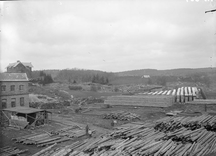 Enligt tidigare noteringar: "Virkesupplag vid tunnfabriken, fabriksbyggnader."