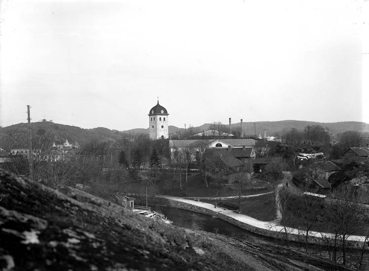 Enligt tidigare noteringar: "Utsikt över Hasselbacken, kyrkan, klocktornet och Kålgårdsberget. Framför kyrkan Uddgrenska huset. Skyttepaviljongen på Kålgårdsberget, revs hösten 1909."
