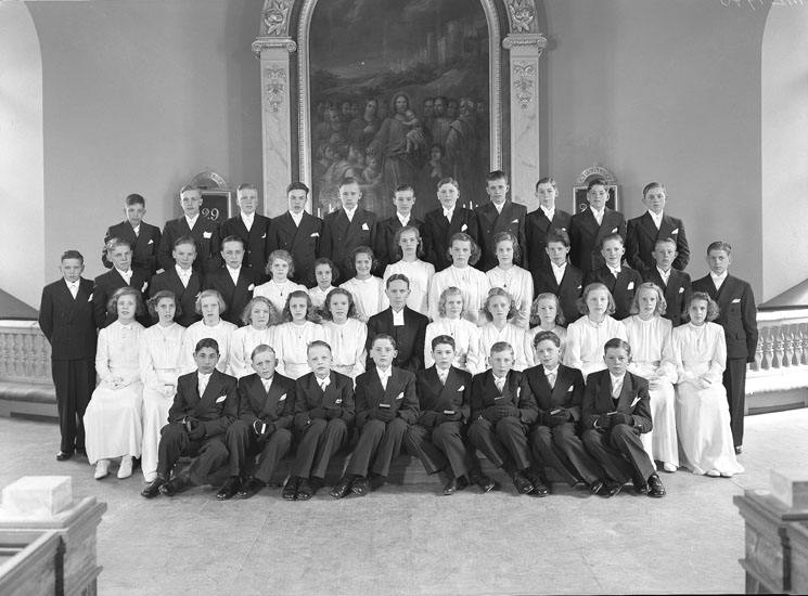 Uppgift enligt fotografen: "Uddevalla. Konfirmander. Stor grupp. Pastor Bergman."