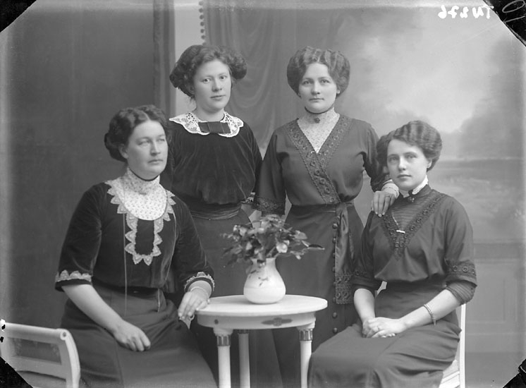 Enligt senare noteringar: "Ateljéfoto av fyra damer, klädda i fina klänningar."