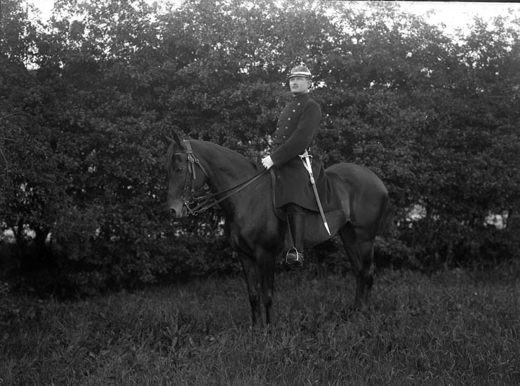 Enligt tidigare noteringar: "Ridande polisen med kask och sabel stationerad generalstrejkåret 1909 i Uddevalla."