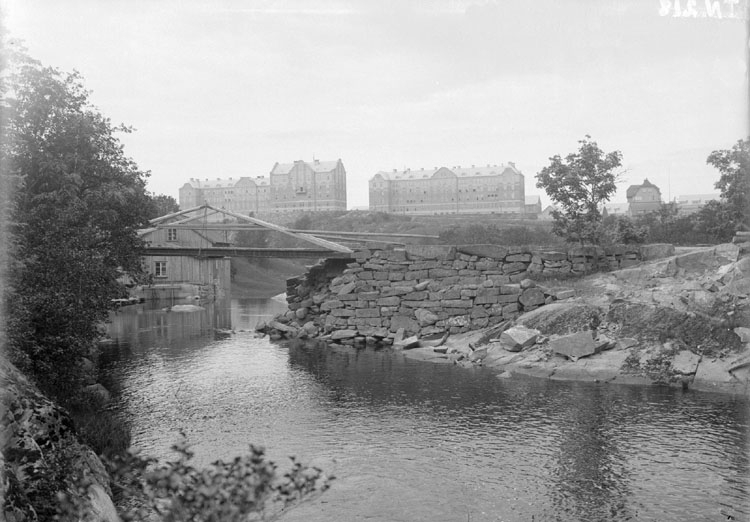 Enligt senare noteringar: "Bron över Bäveån vid Fossums kvarn, i bakgrunden regementsbyggnaderna."