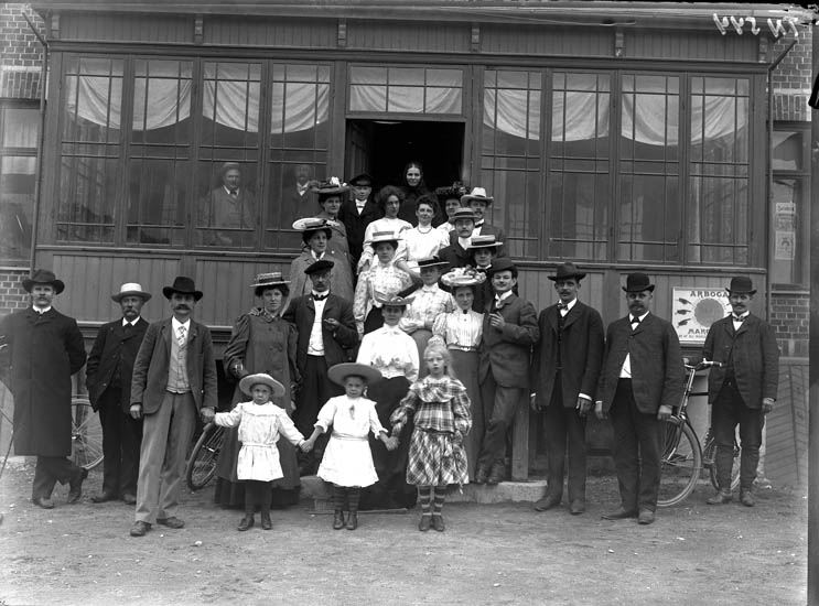Enligt tidigare noteringar: "Grupp personer framför veranda. Hantverkarträff 1910."