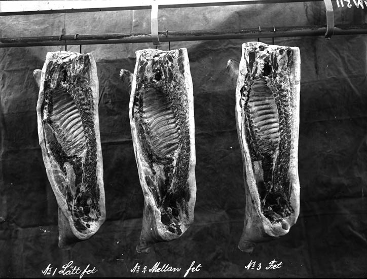 Enligt tidigare noteringar: "Från slakteri, insidan av tre djurkroppar, gris, kvalitetsbedömmning 3 klasser: 1. Lätt fet, 2. Mellanfet, 3. Fet."