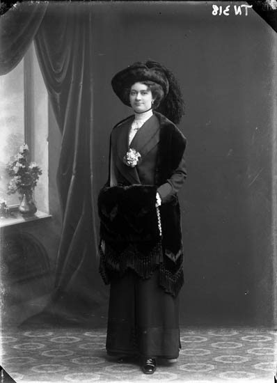 Enligt senare noteringar: "Ateljéfoto av kvinna, klädd i fin dräkt med pälsklädd hatt med plymer, boa och muff."