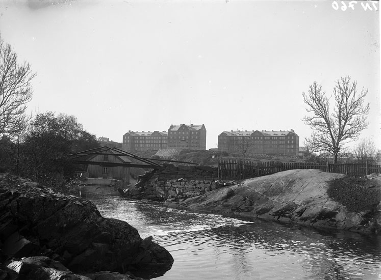 Enligt tidigare noteringar: "Bron över Bäveån vid Fossum samt Bohusläns regementes kasernbyggnader från nordväst."