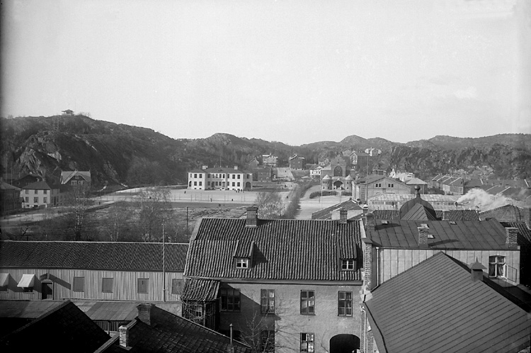 Tidigare notering: "Uddevalla, Utsikt från Klocktornsberget mot Margretegärde med skolorna. Till vänster Kålgårdsberget med paviljongen som revs 1907."