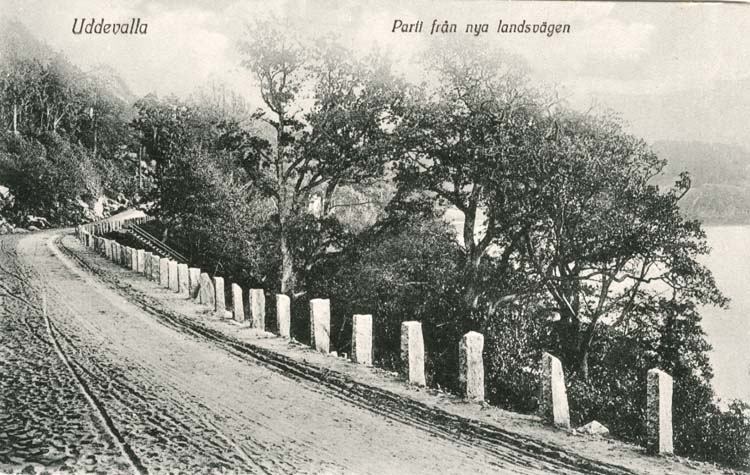 Tryckt text på vykortets framsida: "Uddevalla. Parti från nya landsvägen."