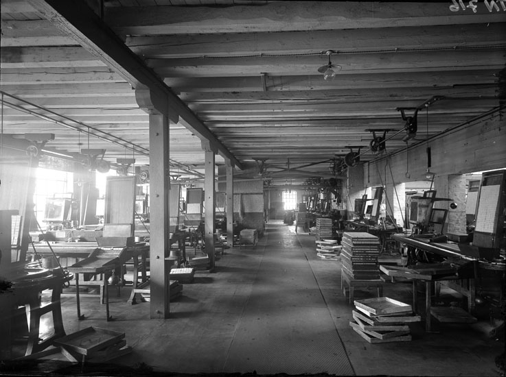 Enligt tidigare noteringar: "Interiör från Uddevalla Tändsticksfabrik. Askfyllningssalen."