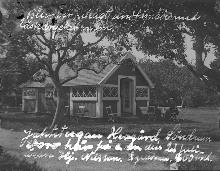 Enligt text på fotot: "Jaktstugan Heagård, Söndrum voro här på e.m. den 21 juli, ägare Hj. Nilsson. Egendom 600 tnd. Blevo här rikligt undfägnade med läskdrycker m.m".