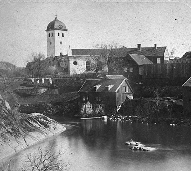 Enligt text på fotot: "Kyrkan och gamla Uddgrenska fastigheten vid Bäveån från sydväst".