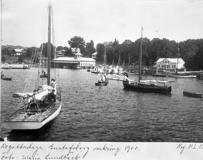Text på kortet: "Regattadags. Gustafsberg omkring 1900. Foto: Maria Lundbäck".