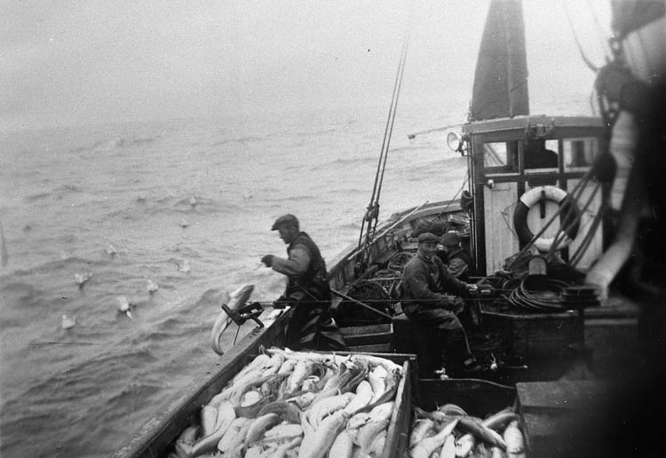 Enligt tidigare noteringar: "Ombord LL 59 "Olive" av Grundsund. Pågående backfiske vid Shetlandsöarna. Vid relingen Paul Gullman, vid vinschen Hjalmar Gullman, bakom Hjalmar G. ses Helmer Hilmersson. I styrhytten John Nilsson.