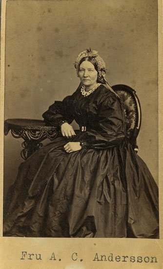 Text på kortets baksida: "Fru Anna Christina Andersson f Renström. Gift med Carl Henrik Andersson i hans andra gifte. Donation med mannen h?46 af 20/11 1879 till U-a stads fattiga samt efter mannens död donation h? 54 af 27/3 1884".