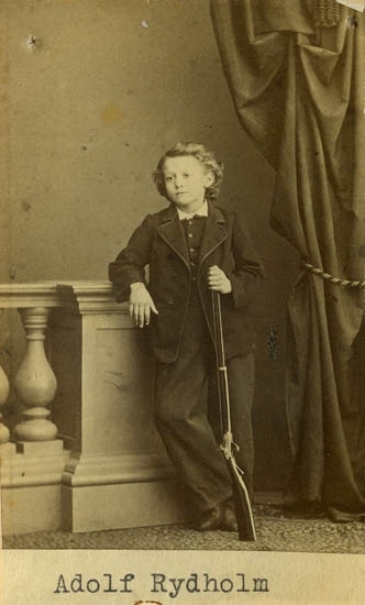 Porträtt av Adolf Rydholm som barn. Han står lutad mot ett räcke och håller i ett gevär.