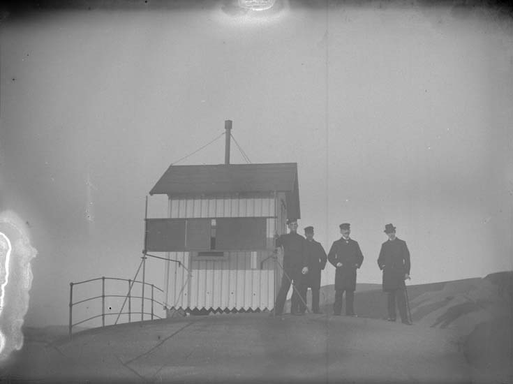 Enligt text som medföljde bilden: "Lysekil. Stångehuvud. Vid fyren Erik, Ahlin, Kalle o. Löfberg."