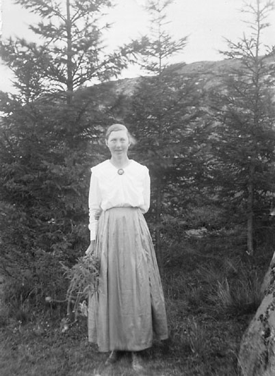 Enligt notering: "Kvinna vid granar, Anni Johansson, Anros".