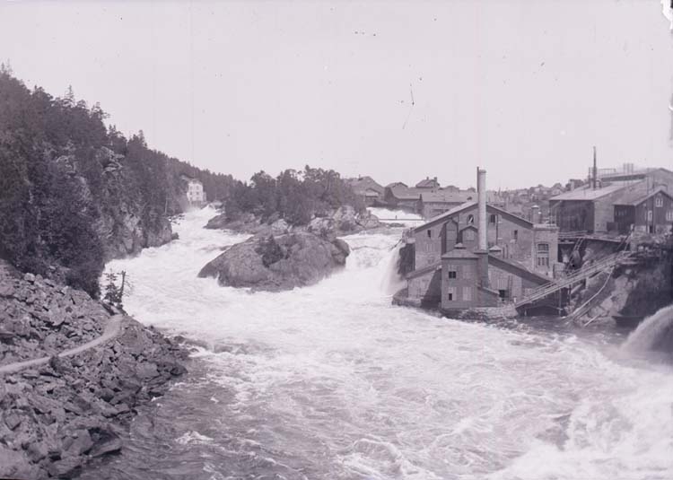 Gullön och Toppön med Önan industriområde till höger och Strömbergs kvarn långt bort på vänstersidan sedda från Kung Oscars bro (Oscarsbron), Trollhättan i maj 1901