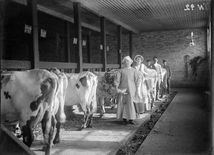 Mjölkningsdags. Interiör från ladugård med kor, två mjölkerskor och tre drängar