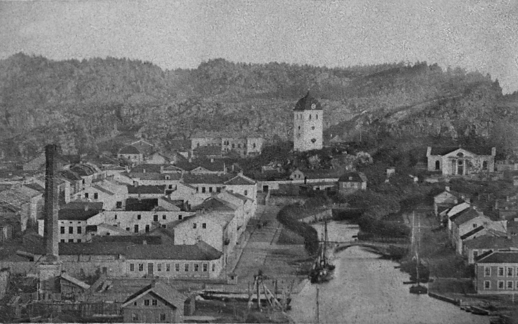 Enligt tidigare noteringar: "Utsikt från Skansberget mot klocktornet över del av Uddevalla med hamnen. Bäveån samt Kampenhof i förgrunden."