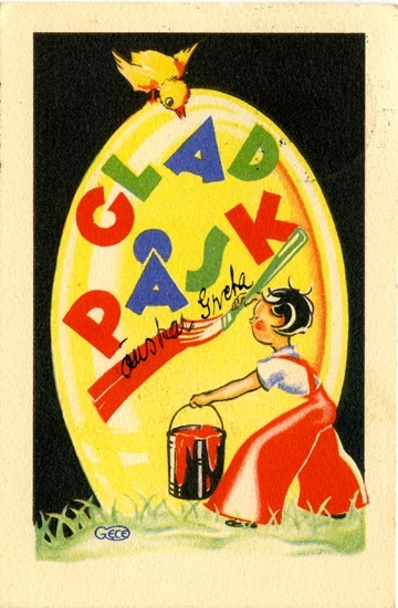 Kort: "Glad Påsk önskar Greta". Barn som målar ett påskägg.