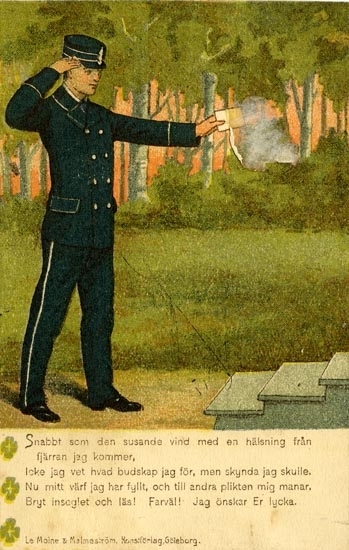 Notering på kortet: Snabbt som den susande vind med hälsning från fjärran jag kommer. Icke jag vet hvad budskap jag för, men skynda jag skulle. Nu mitt värf jag har fyllt, och till andra plikten mig manar. Bryt inseglet och läs! Farväl! Jag önskar er lycka.