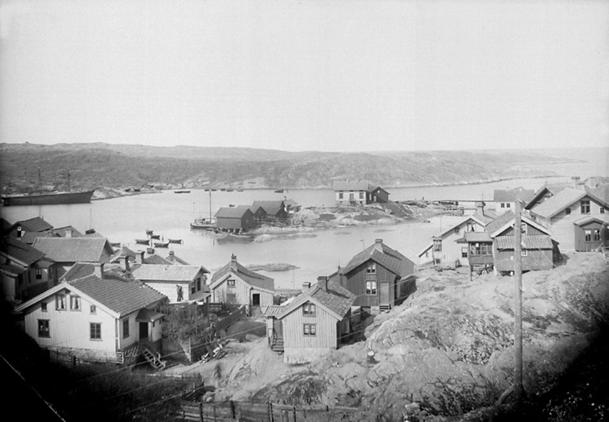 Vy över samhället Mollösund. I förgrunden till vänster snickrar en man på en tillbyggnad till ett bostadshus.