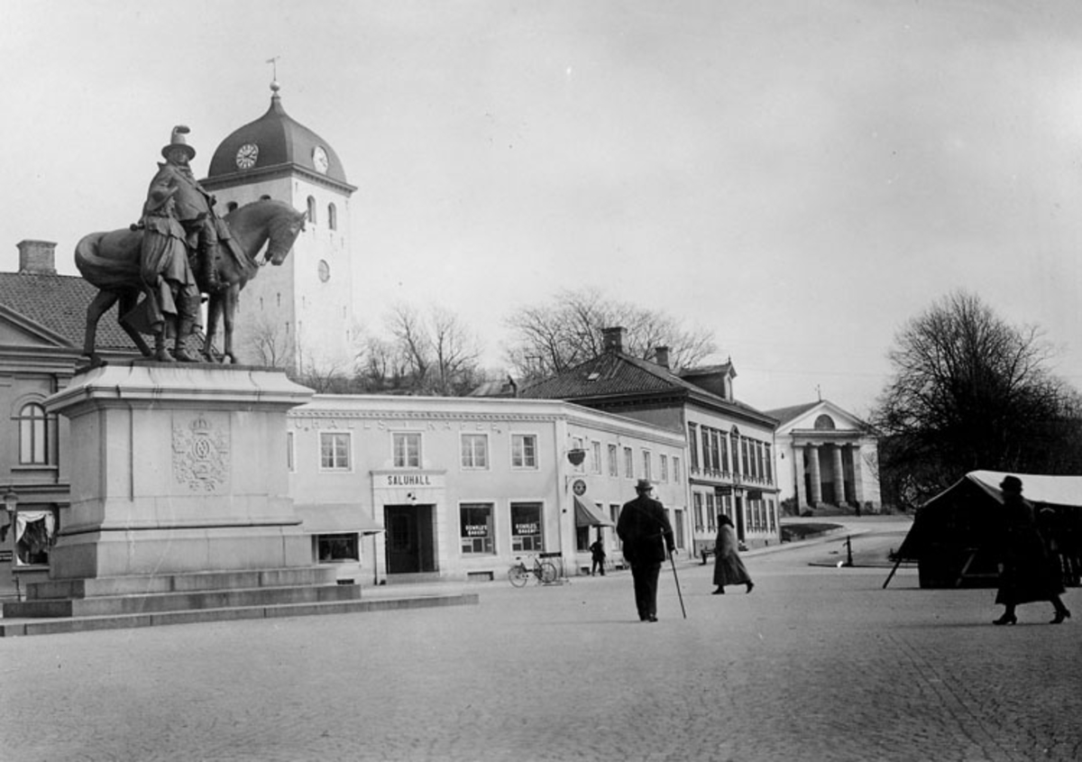 Kungstorget med dubbelstatyn och Uddevalla Saluhall med Saluhallskaféet