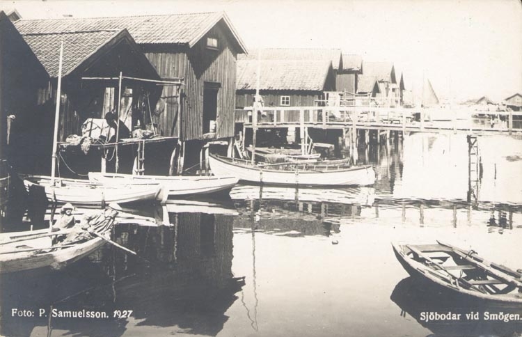 Tryckt text på kortet: "Sjöbodar vid Smögen".
