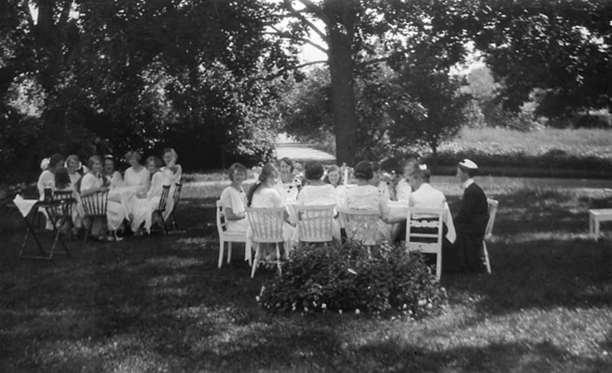 Dukade bord under trädens grönska. Unga kvinnor har samlats vid två bord.