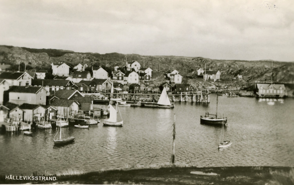 Text på kortet: "Hälleviksstrand. Sjöbodar".