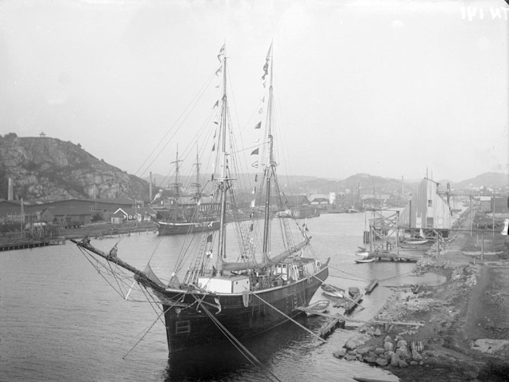 Tvåmastad slätskonare, troligen Ägil ex Sleipner, regnr 3035, med stor flaggning, i Uddevalla hamn. Briggen Emil i bakgrunden."