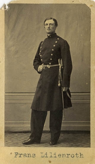 Text på kortets baksida: "Frans Liljenroth, f. 1839 i skåne. Afsked som löjtnant. Fängelsedirektör i Stockholm".