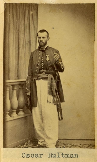 Text på kortets baksida: "Löjtnant Elof Oscar Hultman, Boh. reg. d. 1866. Hustru Berta Kock".