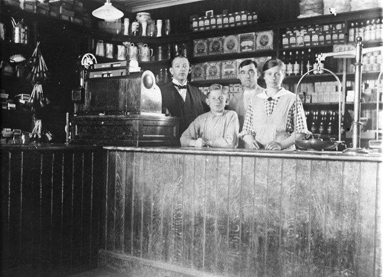 Troligen interiör från Konsums butik i huset "Staben" före 1930.