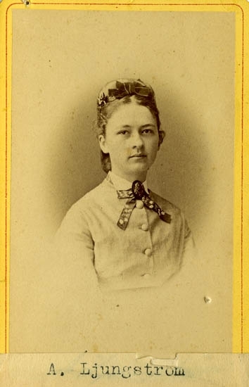 Text på kortets baksida: "Mamsell Amalia Ljungström, dotter till Landtmätaren Jonas Patric Ljungström, Säljhugget".