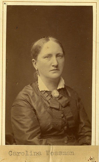 Text på kortets baksida: "Carolina Wessman ene ägarinnan av "Kulan". Född 1856".