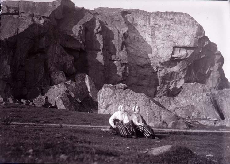 Enligt text som medföljde bilden: "Karin och Lisa. 2 kvinnor klädda i folkdräkt sitter på en äng framför en bergvägg."
