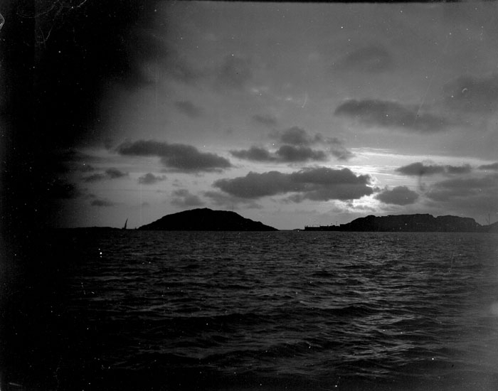 Enligt text som medföljde bilden: "Solnedgång över Stångholmen. Lysekil."