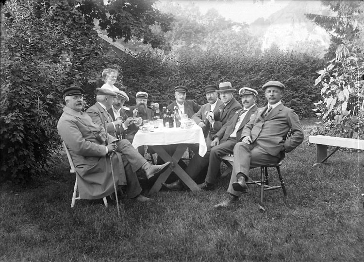 Herrar runt groggbord, några med punschkoppar i hand