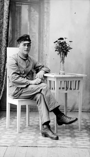 Ateljefoto, man med Postverkets mössa