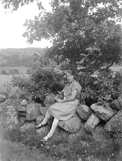 Enligt noteringar: "Kvinna på gärdesgård, Hanna Karlsson, Skistad Åbrott".