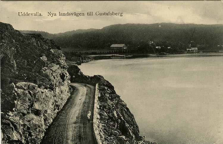 Tryckt text på vykortets framsida: "Uddevalla, Nya landsvägen till Gustafsberg."