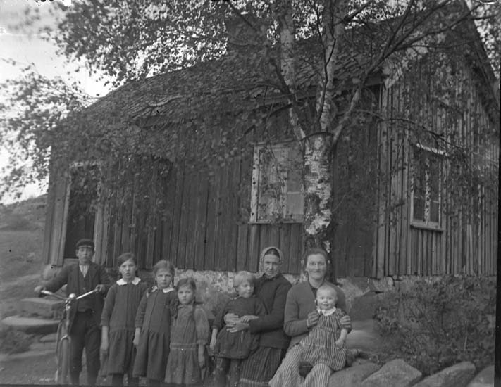 Enligt notering: "Framför huset, två vuxna, sex barn".