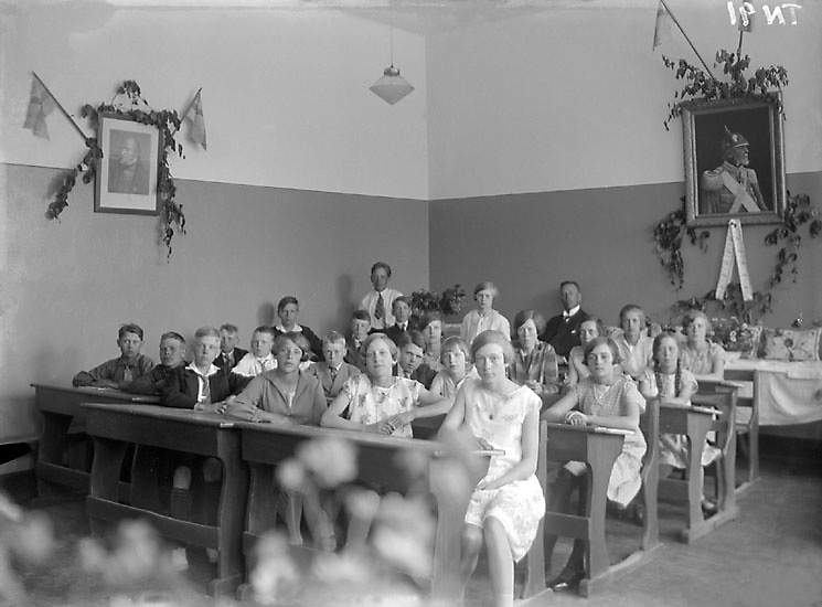 "Klassrum, smyckat inför examen. Lärare och elever.