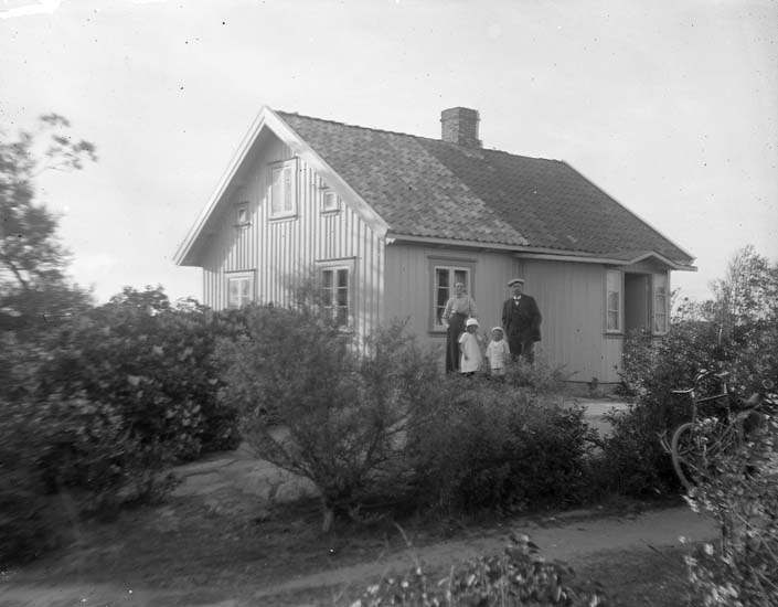 Enligt notering: "Två vuxna, två barn framför huset, Lunden Hög-Edsten, Karl Johansson?".