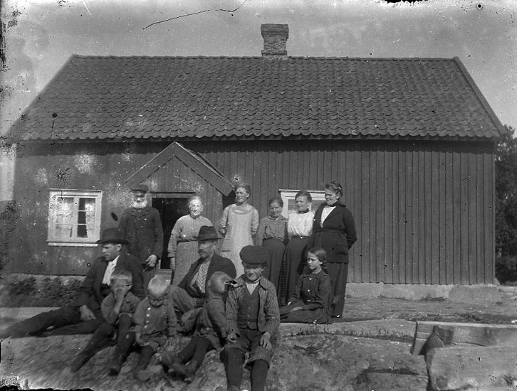 Enligt notering: "Gruppfoto: Stora och små framför huset".