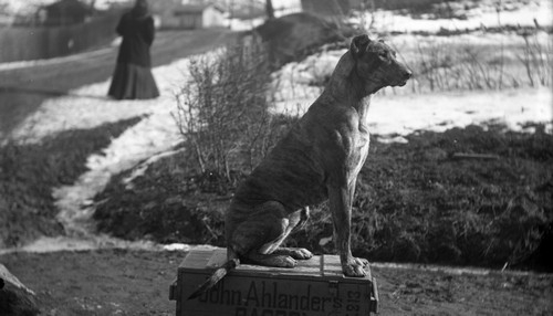 Hund poserar på transportlåda tillhörande John Ahlanders bageri, Munkedal