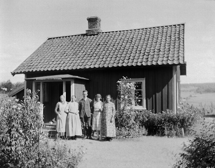 Fyra kvinnor, bl. a. Anna Pettersson och Augusta Forsberg, och en man, Artur Pettersson, poserar utanför en stuga. I förgrunden ses delar av en trädgård med ett stort antal olika växter.